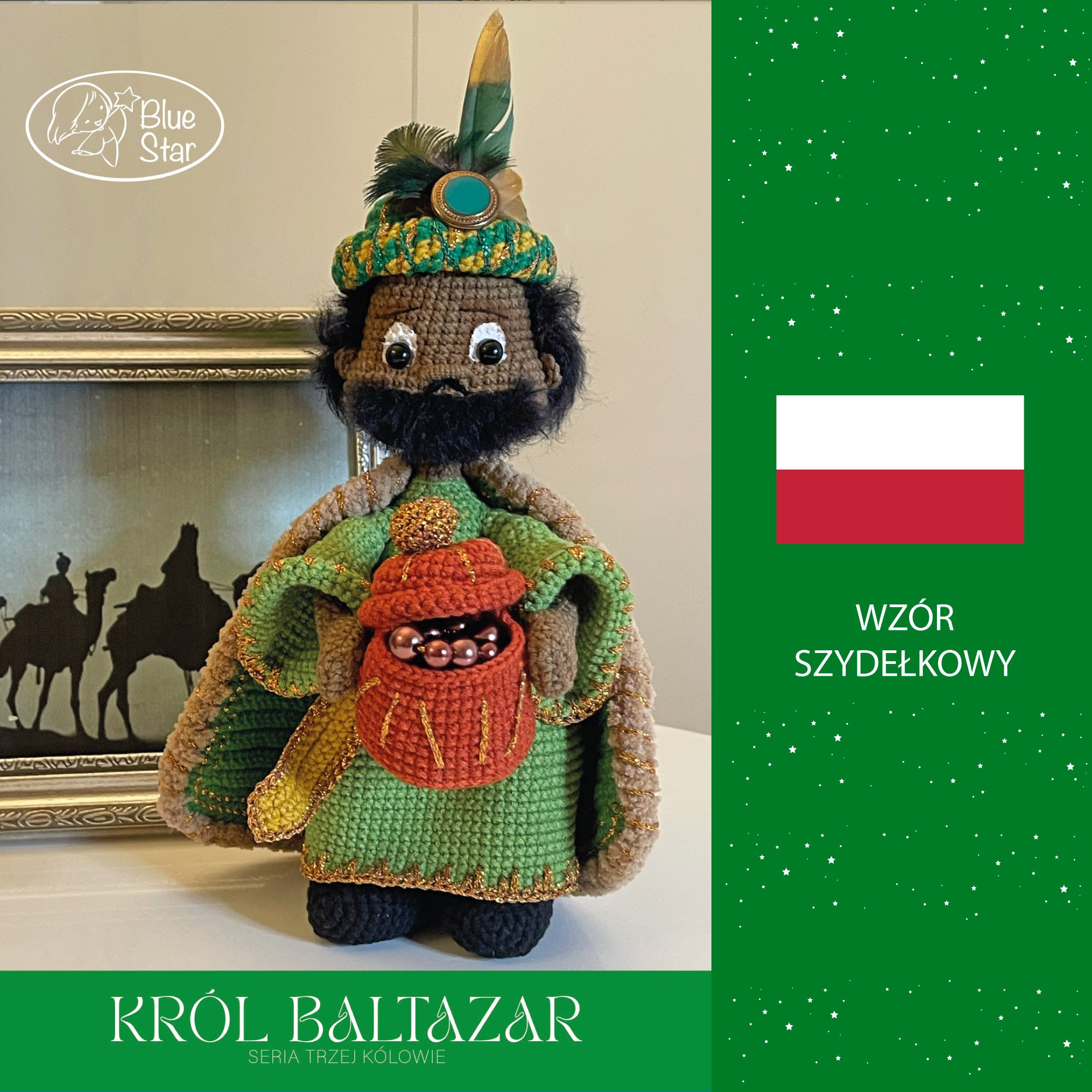 Wzór zawiera opis i zdjęcia szydełkowanego Króla Baltazara. Figurka ma ok 25 cm, jest na stelarzu, więc może stać lub klęczeć.