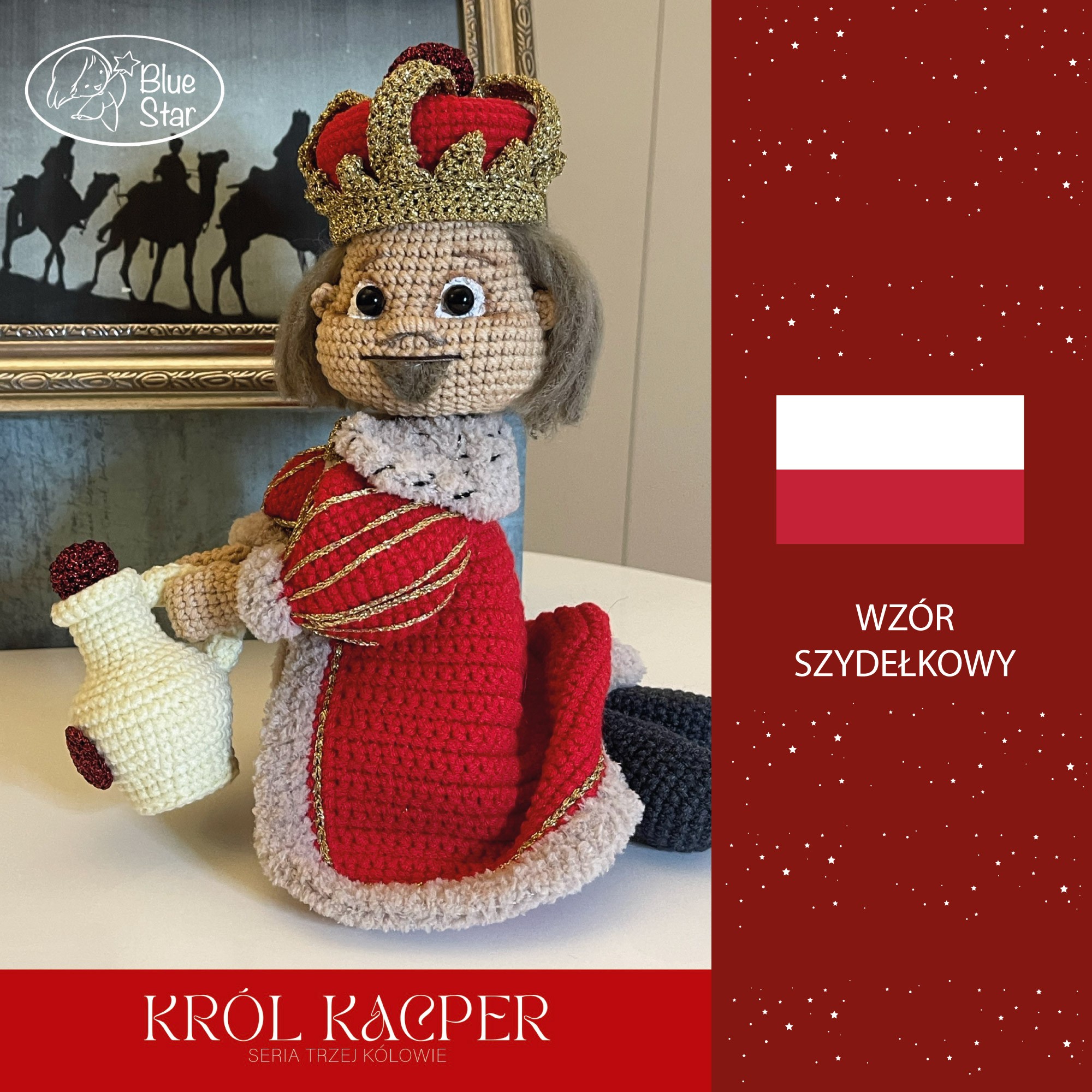 Wzór zawiera opis i zdjęcia szydełkowanego Króla Kacpra. Figurka ma ok 25 cm, jest na stelarzu, więc może stać lub klęczeć.