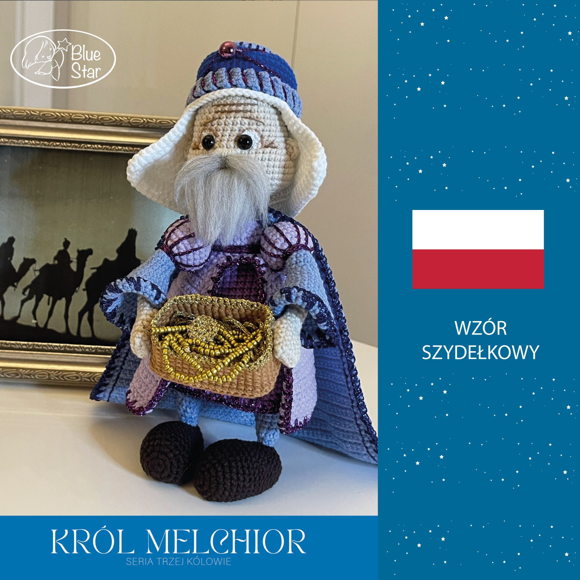 Wzór zawiera opis i zdjęcia szydełkowanego Króla Melchiora. Figurka ma ok 25 cm, jest na stelarzu, więc może stać lub klęczeć.
