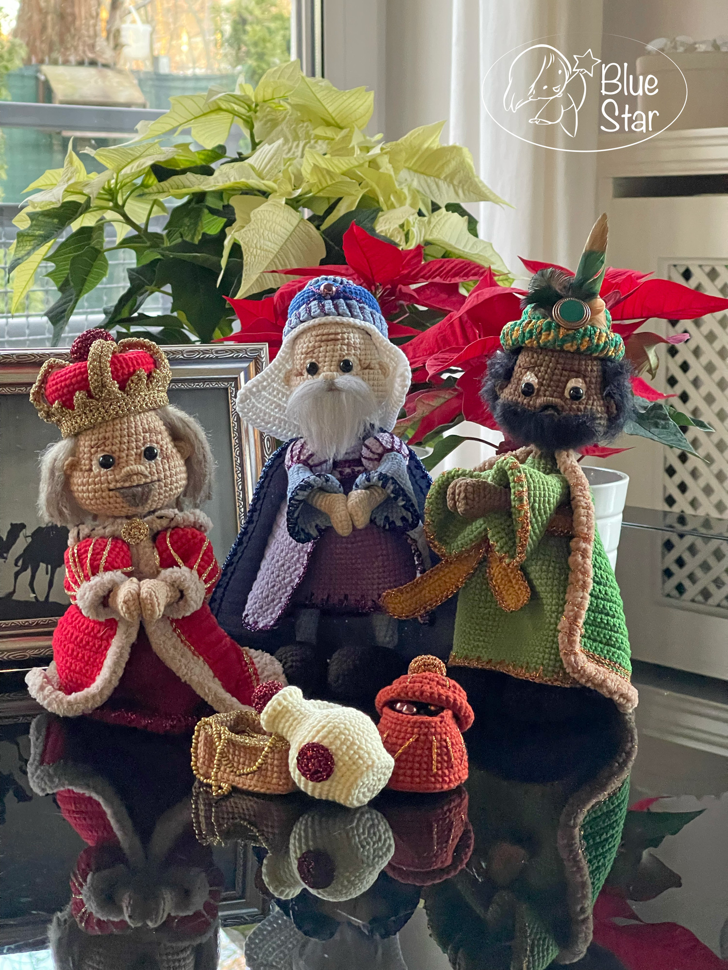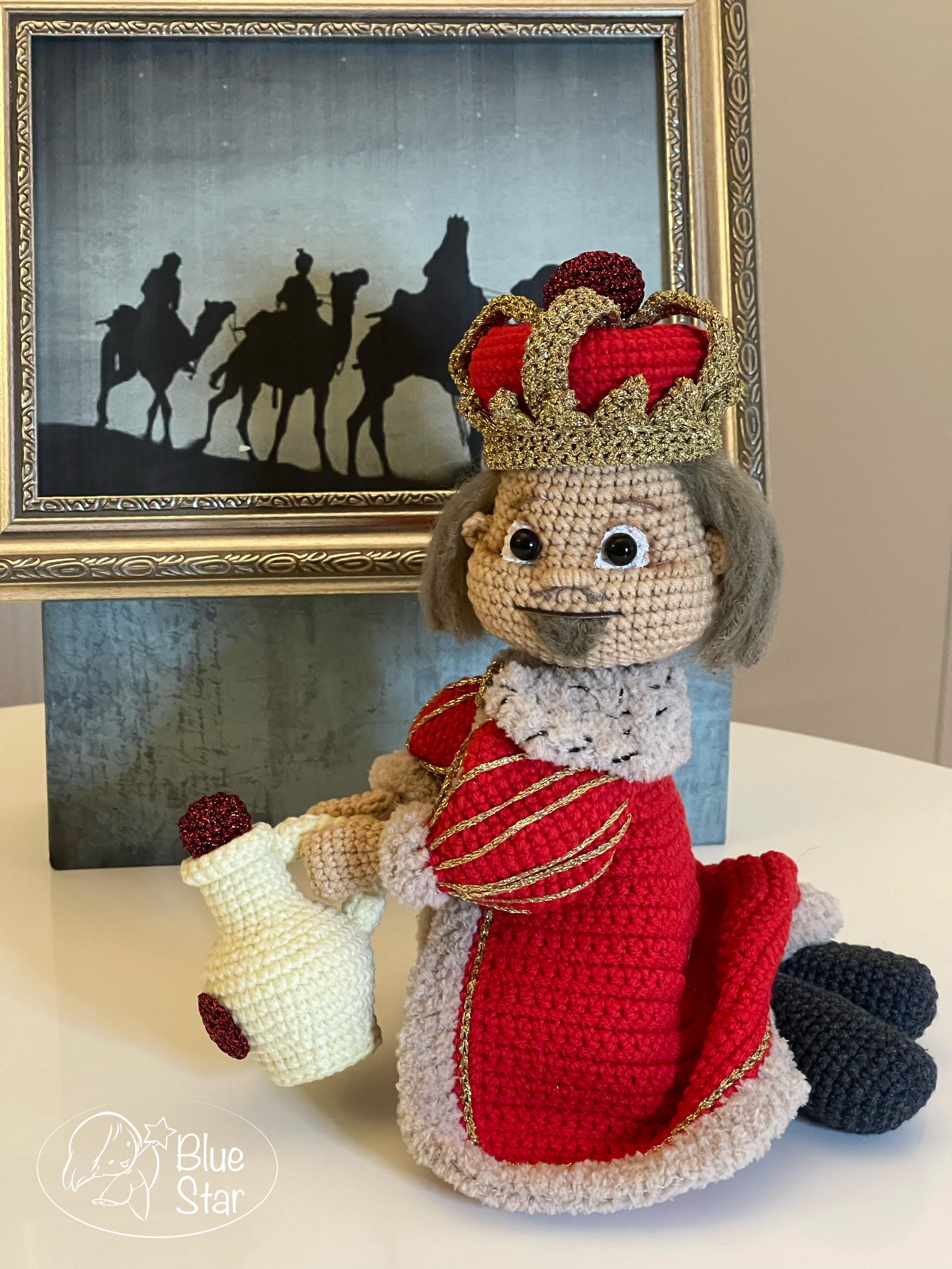 Wzór zawiera opis i zdjęcia szydełkowanego Króla Kacpra. Figurka ma ok 25 cm, jest na stelarzu, więc może stać lub klęczeć.