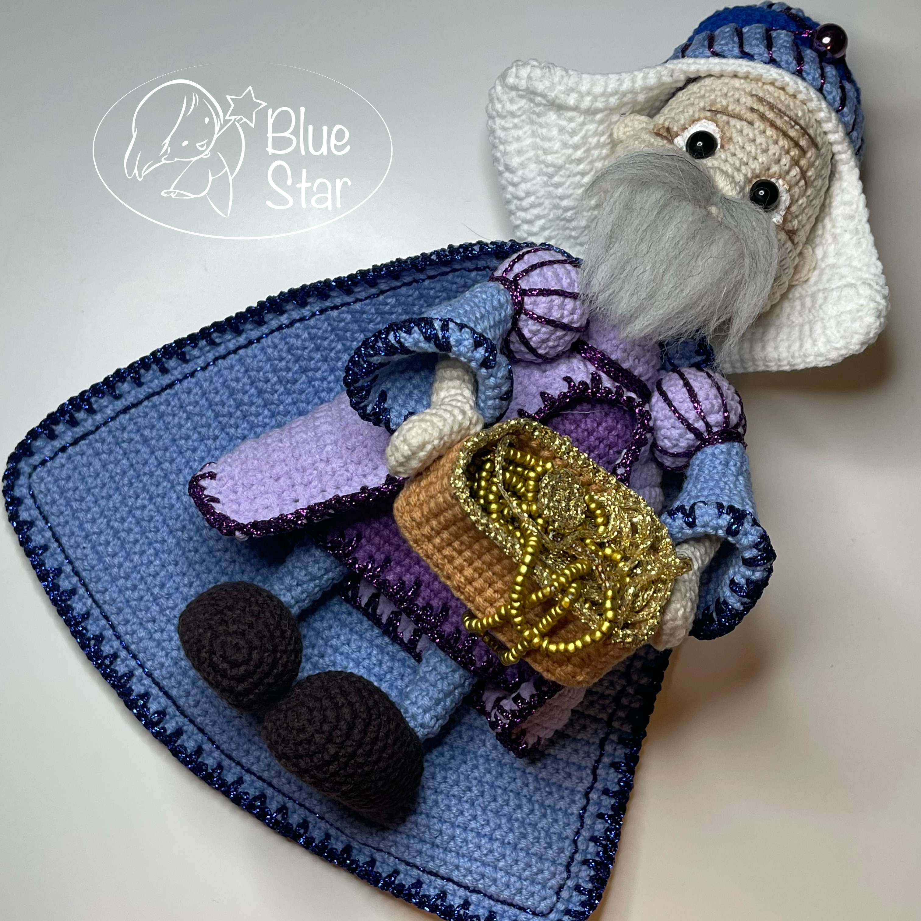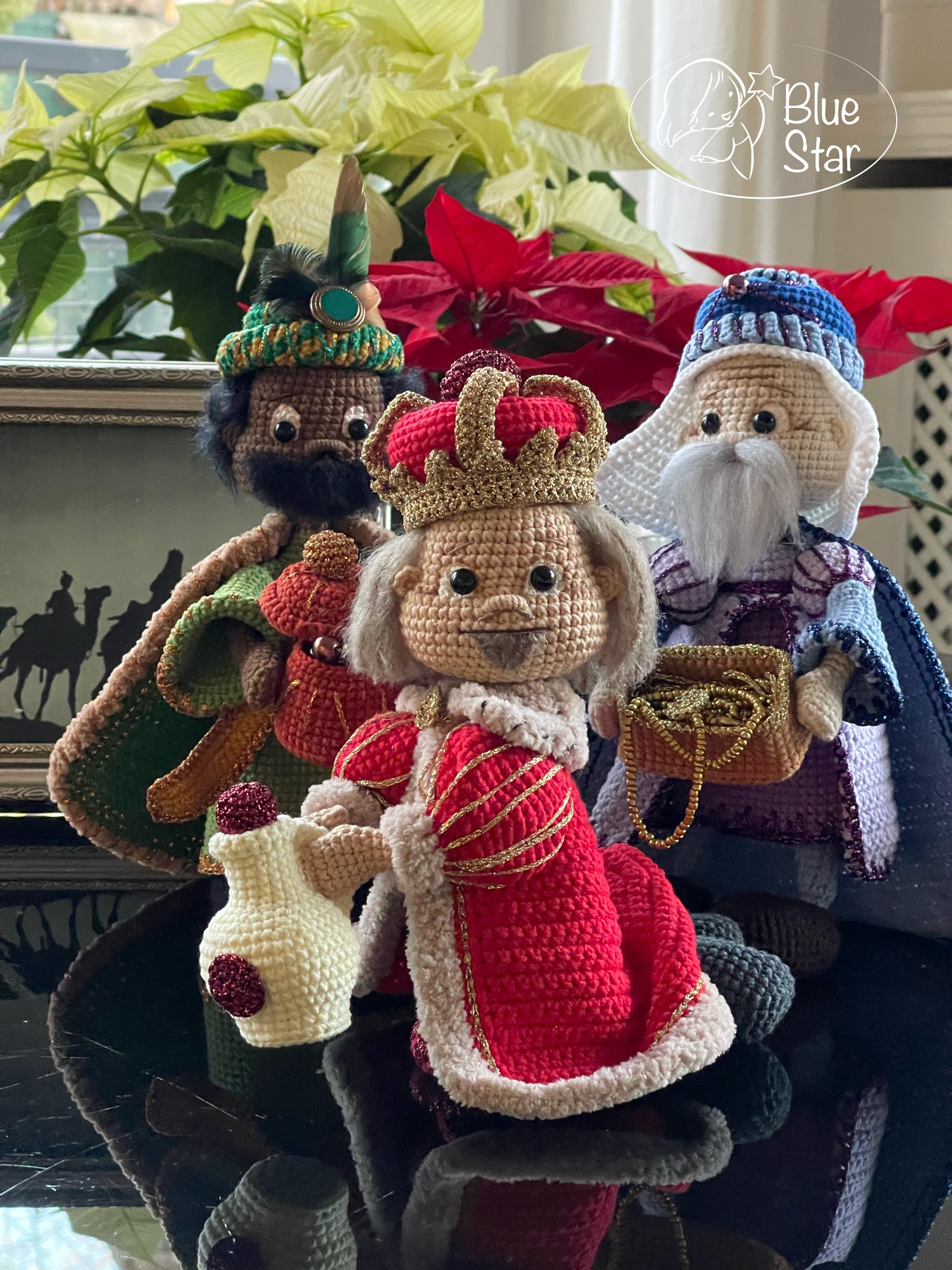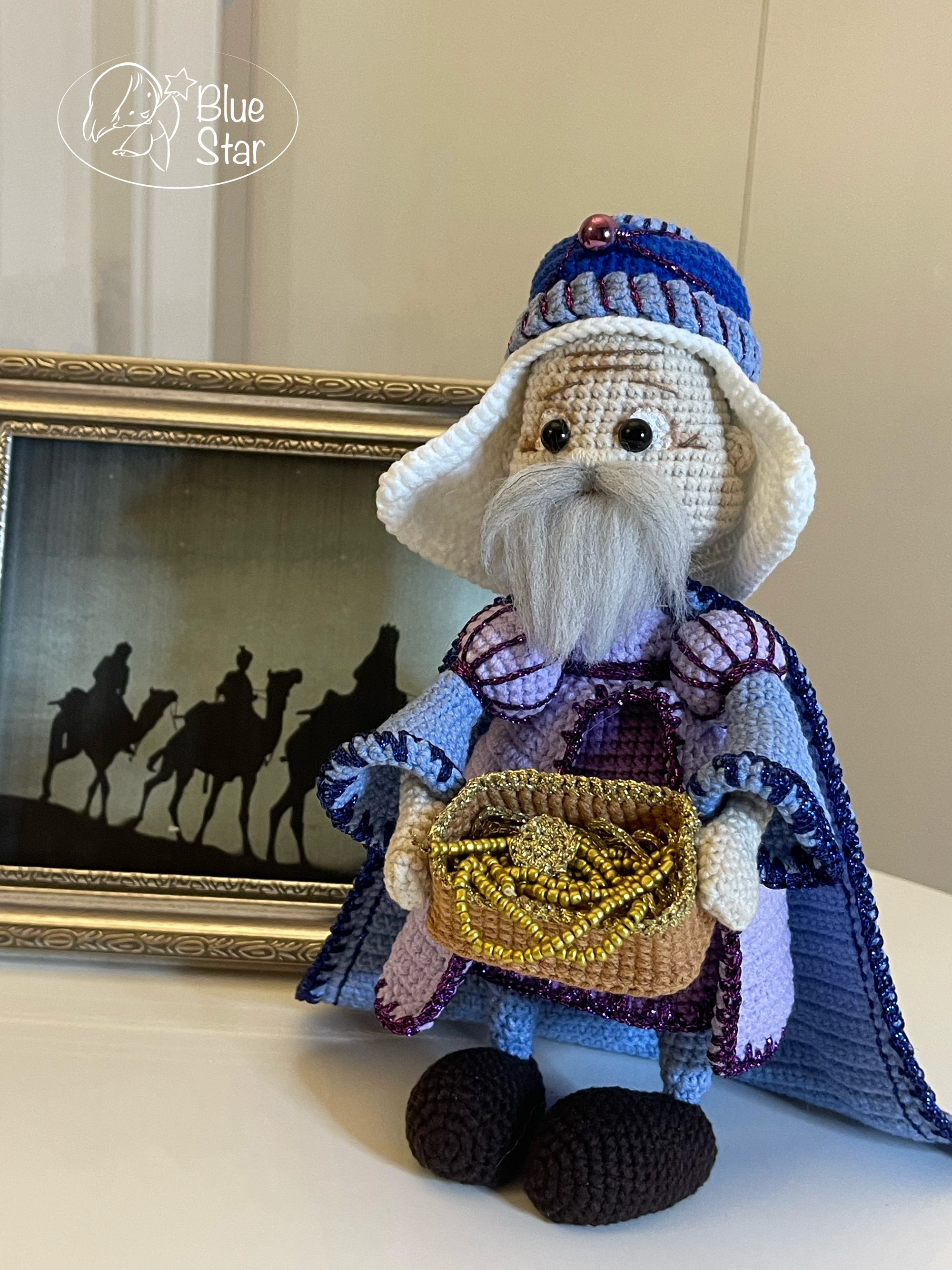 Wzór zawiera opis i zdjęcia szydełkowanego Króla Melchiora. Figurka ma ok 25 cm, jest na stelarzu, więc może stać lub klęczeć.
