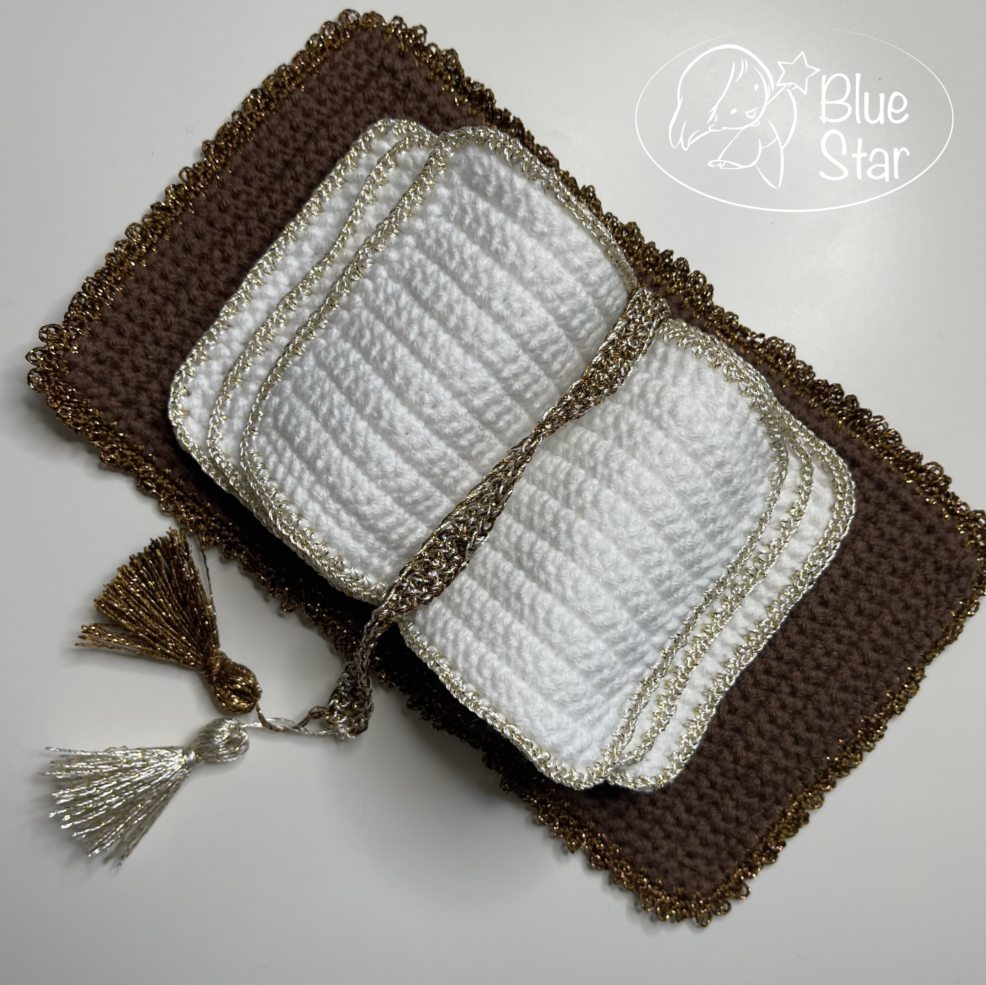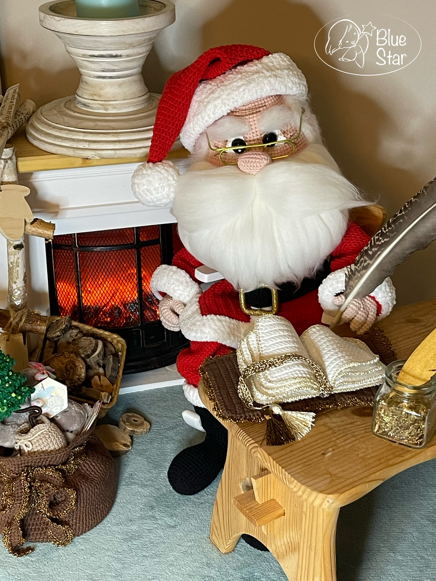 Wzór zawiera opis i ponad 140 zdjęć szydełkowanego Mikołaja siedzącego oraz film instuktażowy – broda i wąsy. W pliku jest również wzór na szydełkowaną książkę i świąteczny worek na prezenty oraz instrukcja jak wykonać samodzielnie okulary.