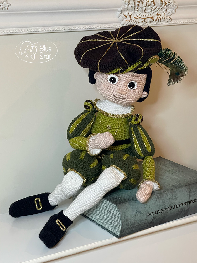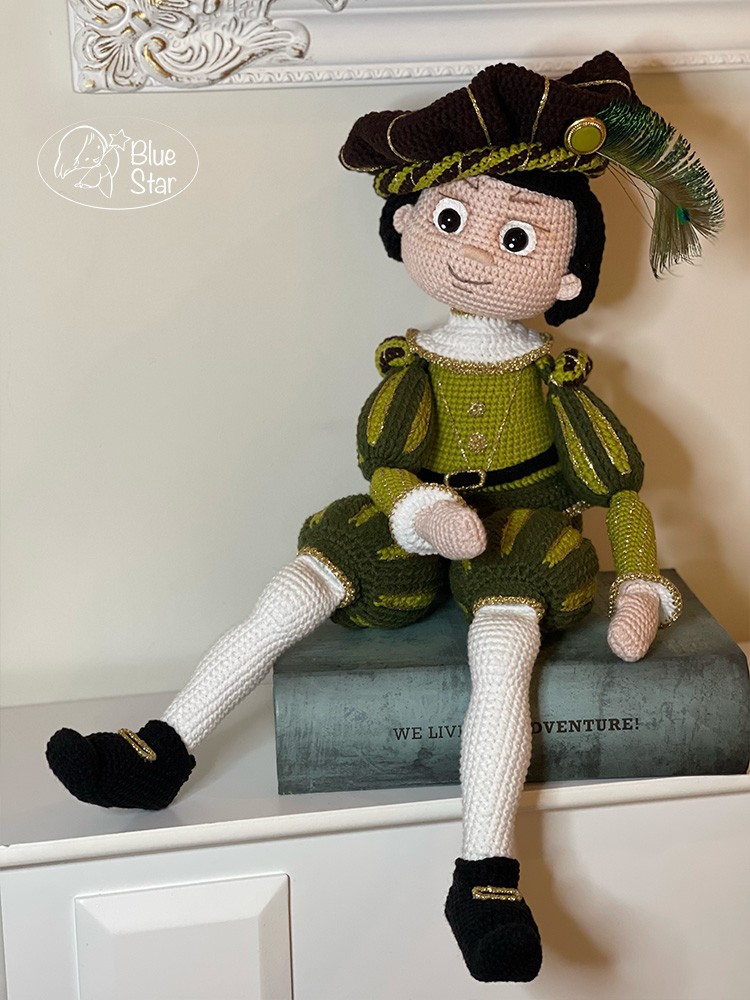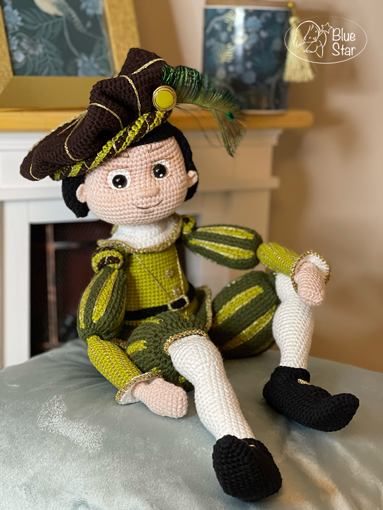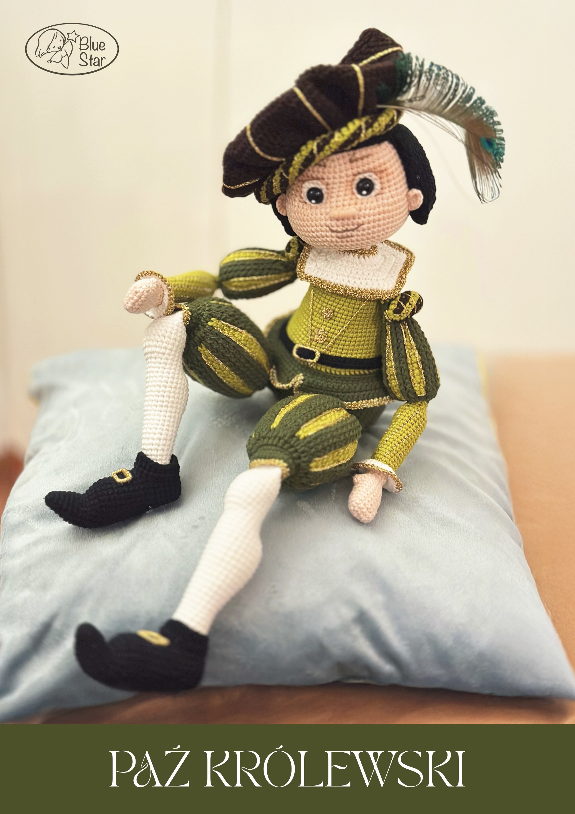 Wzór zawiera opis, zdjęcia i filmy instruktażowe szydełkowanego Pazia. Jeżeli użyjesz włóczek podanych we wzorze oraz szydełka 2mm, gotowy Paź będzie miał ok. 40cm wysokości.