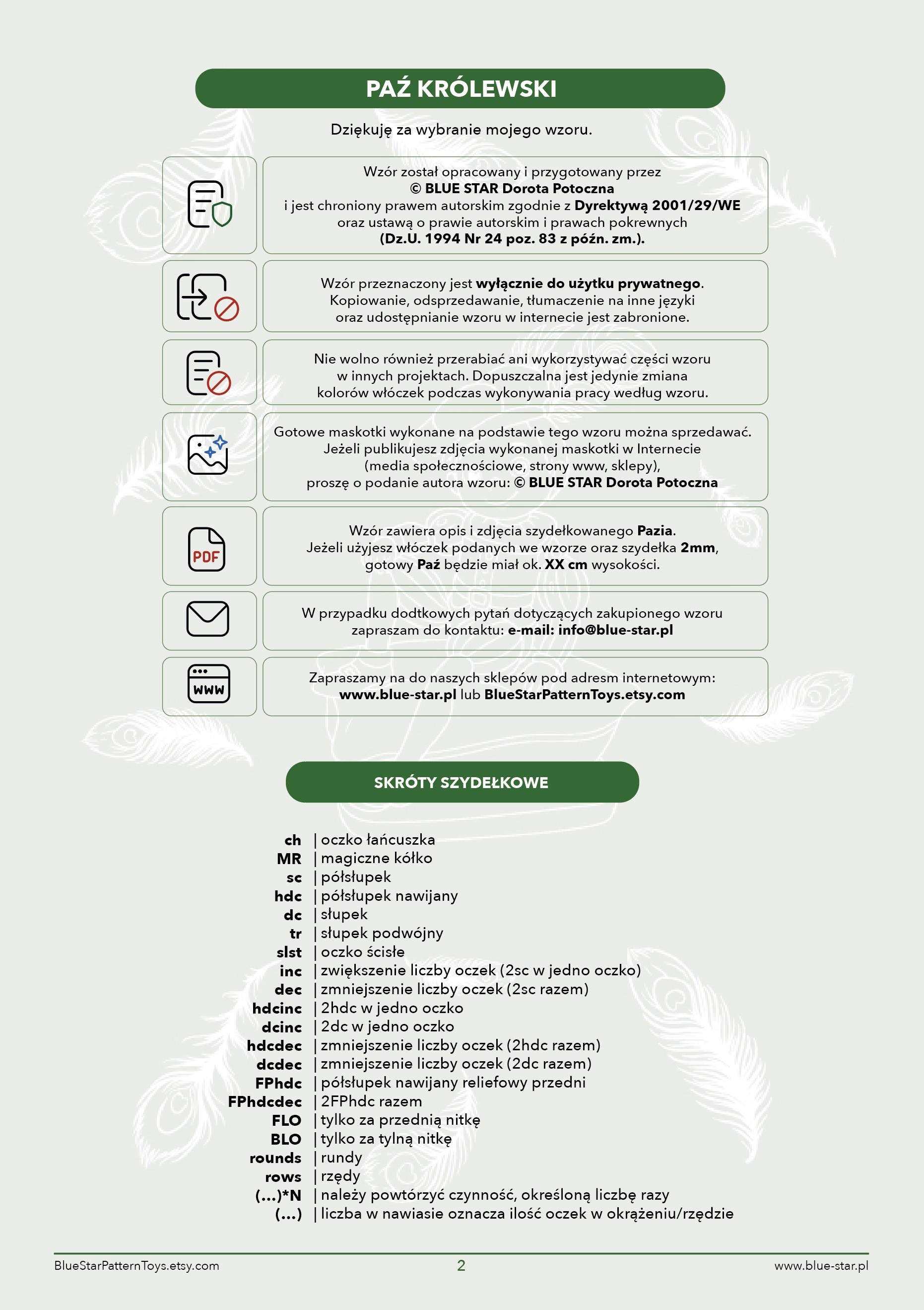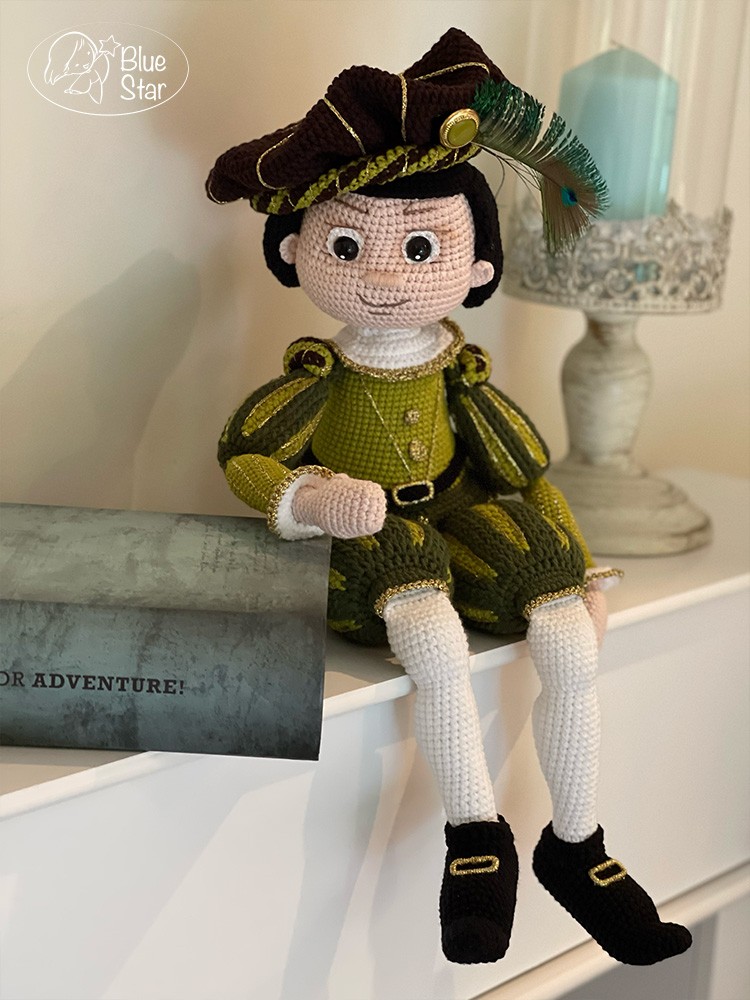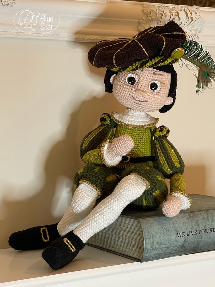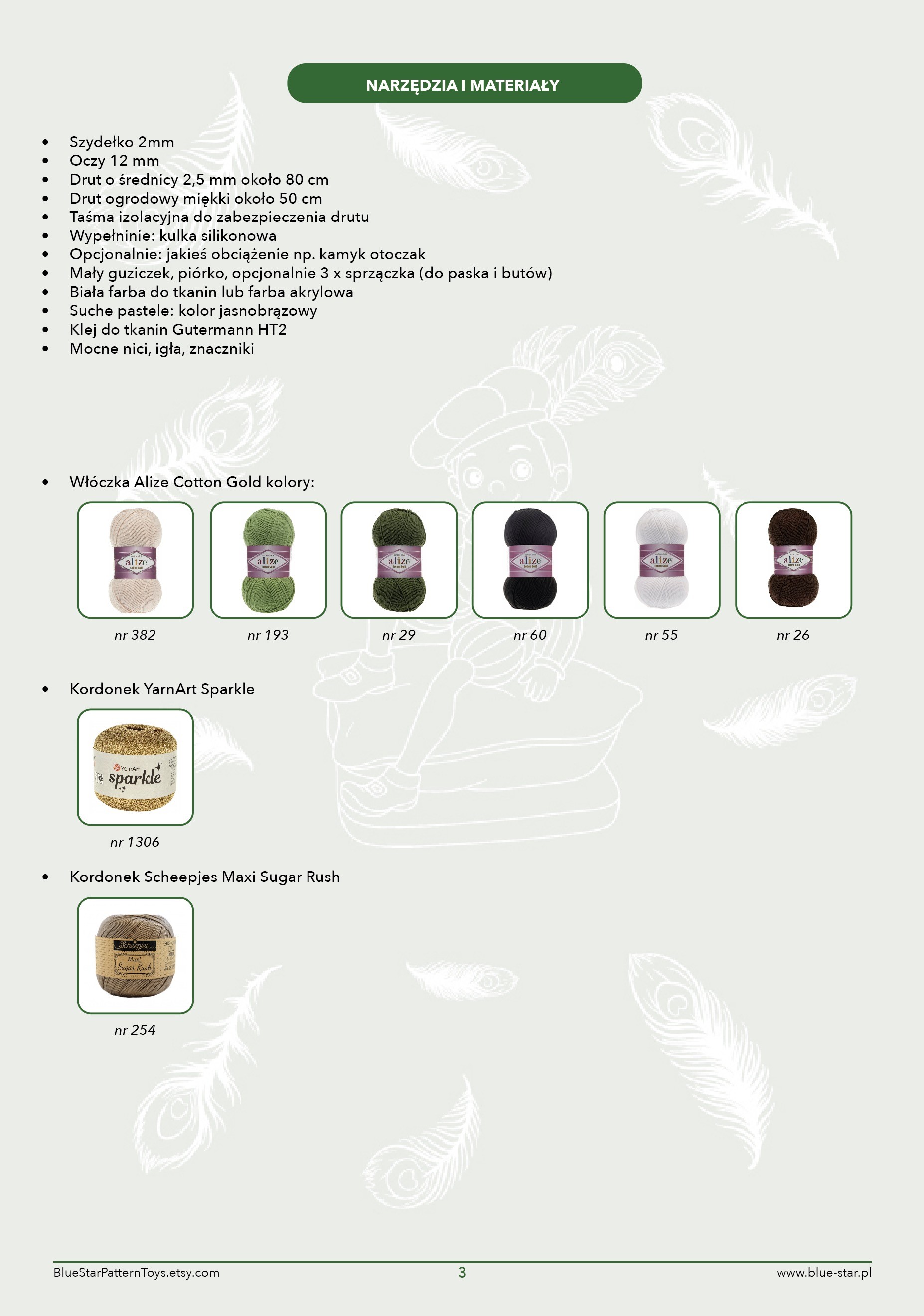 Wzór zawiera opis, zdjęcia i filmy instruktażowe szydełkowanego Pazia. Jeżeli użyjesz włóczek podanych we wzorze oraz szydełka 2mm, gotowy Paź będzie miał ok. 40cm wysokości.